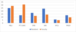 Residents and faculty were asked to rank the six competencies as they are prioritized within their residency program. Competencies were listed per ACGME parlance with no further explanation. Faculty felt patient care was the most important competency. Residents felt Practice-Based Learning and Improvement and Medical Knowledge were most important. Both ranked interpersonal and communication skills least important and professionalism second least important competency. (Fig. 1).